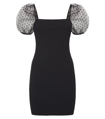 Petite Black Organza Spot Puff Sleeve casual black dress with sleeves