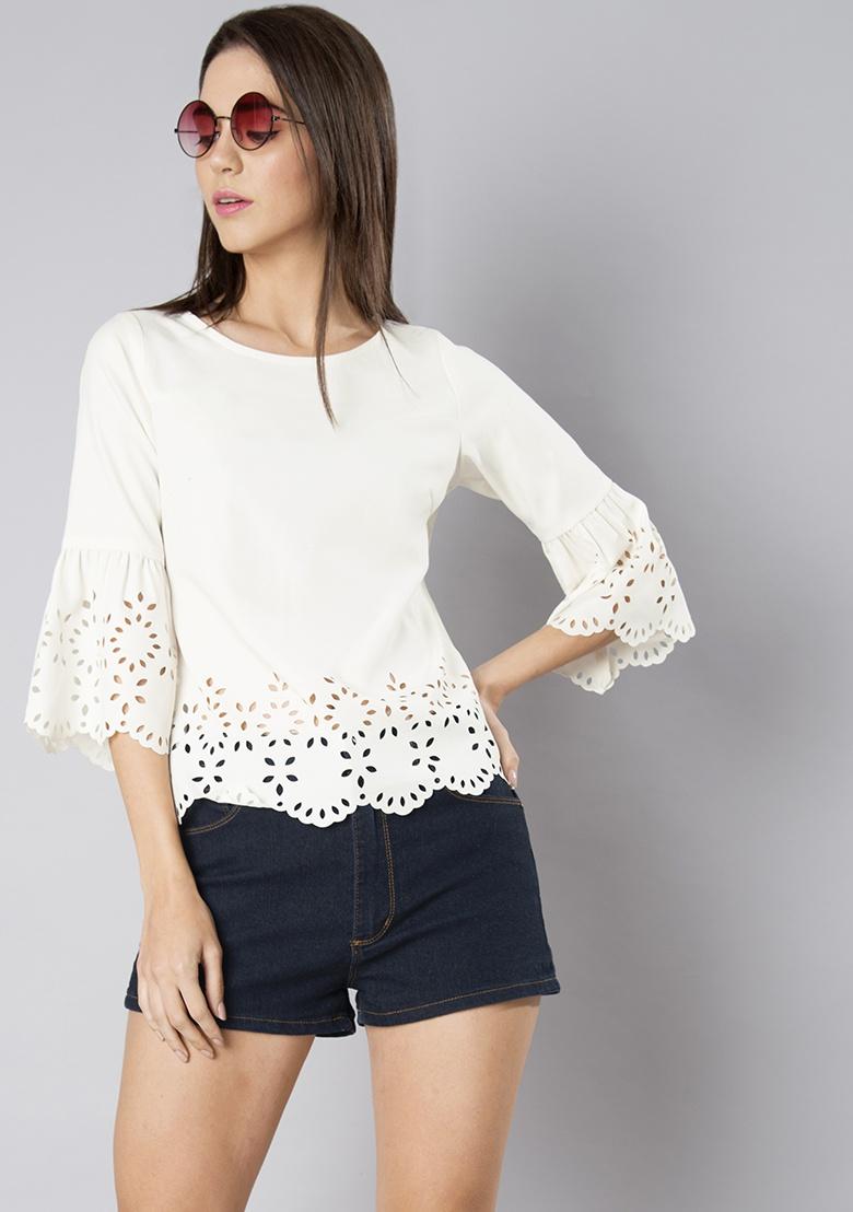 Women White Laser Cut Bell Sleeve Top white dress top