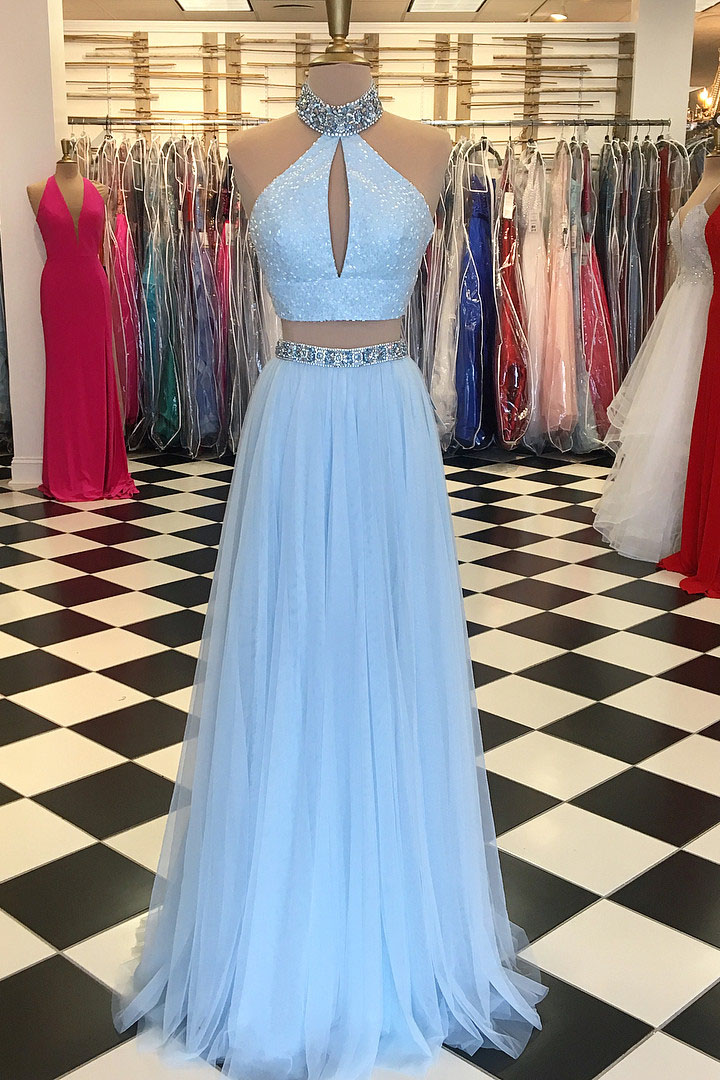 Light Blue Beaded Prom Dress,High Neck one piece prom dresses