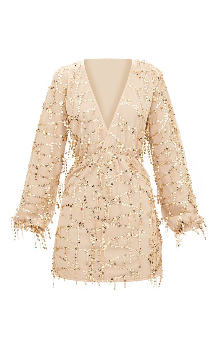 gold plunge sequin long sleeve bodycon dress