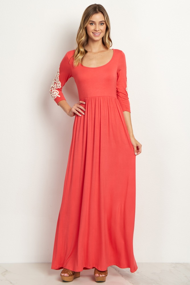 Coral Crochet Sleeve Maternity Maxi Dress coral maxi dress with sleeves