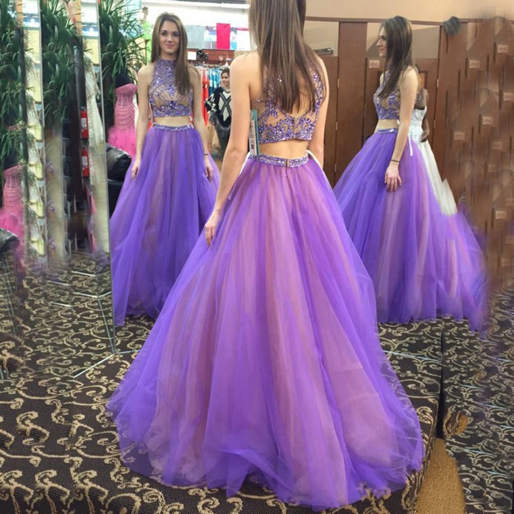 Two Piece Long Prom Dresses High Neck purple two piece homecoming dress