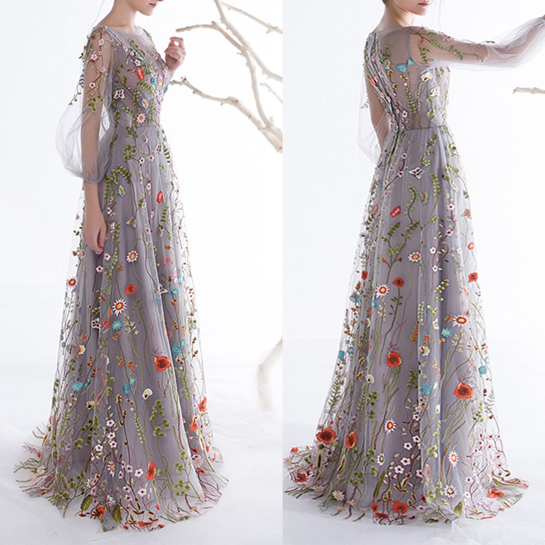 Womens Long Sleeves Prom Dresses floral long frocks for ladies